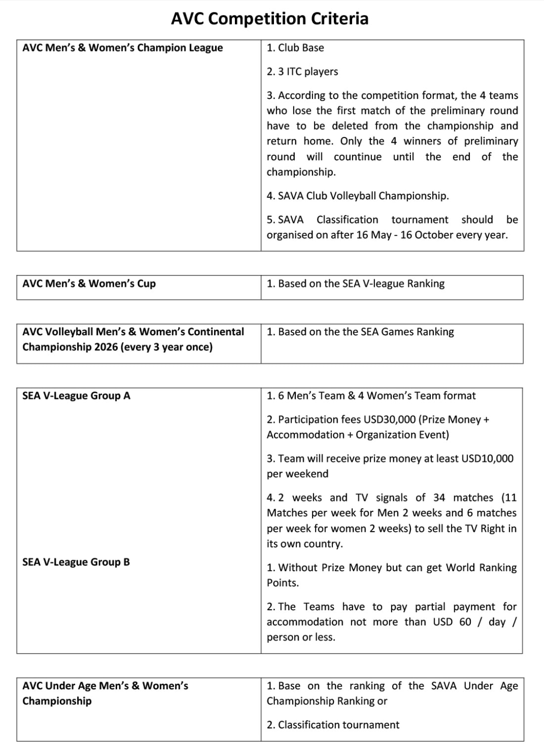 Untuk AVC Cup, SAVA menegaskan bahwa penentuan peserta sepenuhnya didasarkan pada peringkat SEA V-League. Artinya, performa negara-negara Asia Tenggara di ajang SEA V-League akan sangat menentukan peluang tampil di level AVC.